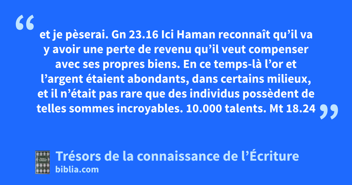 et je pèserai. Gn 23.16 Ici Haman reconnaît qu’il va y avoir une perte de revenu qu’il veut compenser avec ses propres biens. En ce temps-là l’or et l’argent étaient abondants, dans certains milieux, et il n’était pas rare que des individus possèdent de telles sommes incroyables. 10.000 talents. Mt 18.24