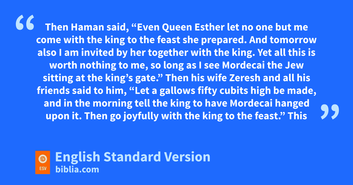 9 And Haman went out that day hjoyful and glad of heart. But when Haman saw Mordecai iin the king’s gate, jthat he neither rose nor trembled before him, he was filled with wrath against Mordecai. 10 Nevertheless, Haman restrained himself and went home, and he sent and brought his friends and khis wife Zeresh. 11 And Haman recounted to them the splendor of his riches, lthe number of his sons, all the promotions with which mthe king had honored him, and how he had advanced him above the officials and the servants of the king. 12 Then Haman said, “Even Queen Esther let no one but me come with the king to the feast she prepared. And tomorrow also I am invited by her together with the king. 13 Yet all this is worth nothing to me, so long as I see Mordecai the Jew sitting iat the king’s gate.” 14 Then khis wife Zeresh and all his friends said to him, n“Let a gallows4 fifty cubits5 high be made, and in the morning tell the king to have Mordecai hanged upon it. Then go joyfully with the king to the feast.” This idea pleased Haman, and he had the gallows made.
