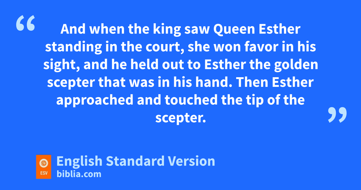 5 yOn the third day Esther put on her royal robes and stood in zthe inner court of the king’s palace, in front of the king’s quarters, while the king was sitting on his royal throne inside the throne room opposite the entrance to the palace. 2 And when the king saw Queen Esther standing in the court, ashe won favor in his sight, band he held out to Esther the golden scepter that was in his hand. Then Esther approached and touched the tip of the scepter. 3 And the king said to her, “What is it, Queen Esther? What is your request? It shall be given you, even cto the half of my kingdom.” 4 And Esther said, “If it please the king,1 let the king and Haman come today to a feast that I have prepared for the king.” 5 Then the king said, “Bring Haman quickly, so that we may do as Esther has asked.” So the king and Haman came to the feast that Esther had prepared. 6 dAnd as they were drinking wine after the feast, the king said to Esther, e“What is your wish? It shall be granted you. And what is your request? cEven to the half of my kingdom, it shall be fulfilled.”2 7 Then Esther answered, “My wish and my request is: 8 fIf I have found favor in the sight of the king, and if it please the king3 to grant my wish and fulfill my request, let the king and Haman come to gthe feast that I will prepare for them, and tomorrow I will do as the king has said.”