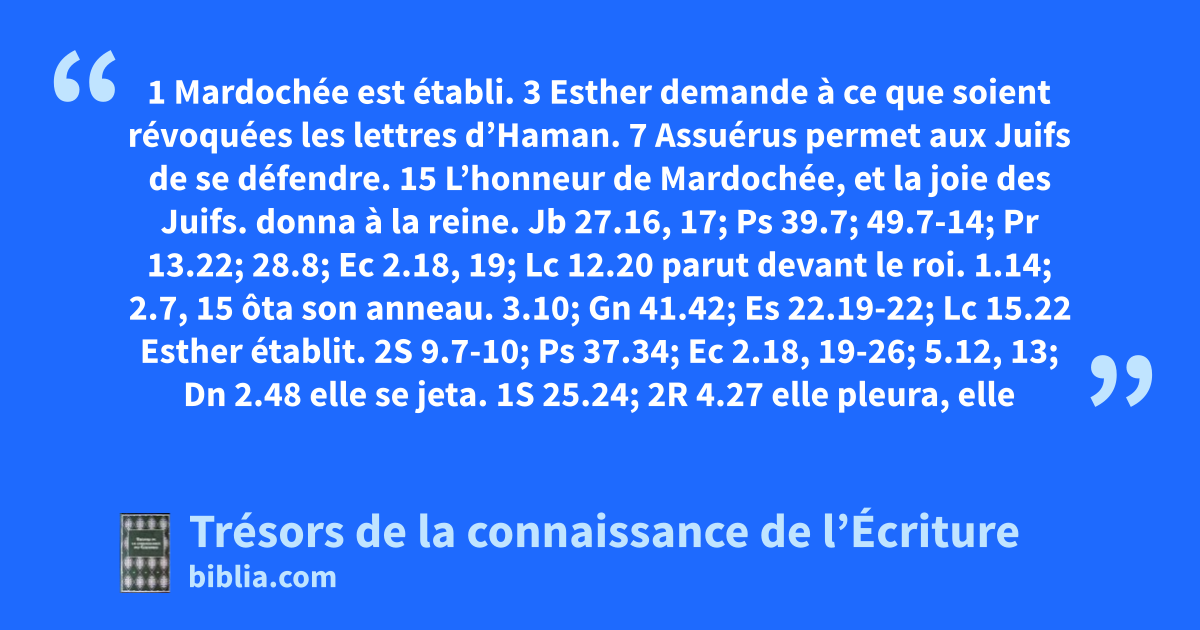 1 Mardochée est établi. 3 Esther demande à ce que soient révoquées les lettres d’Haman. 7 Assuérus permet aux Juifs de se défendre. 15 L’honneur de Mardochée, et la joie des Juifs.