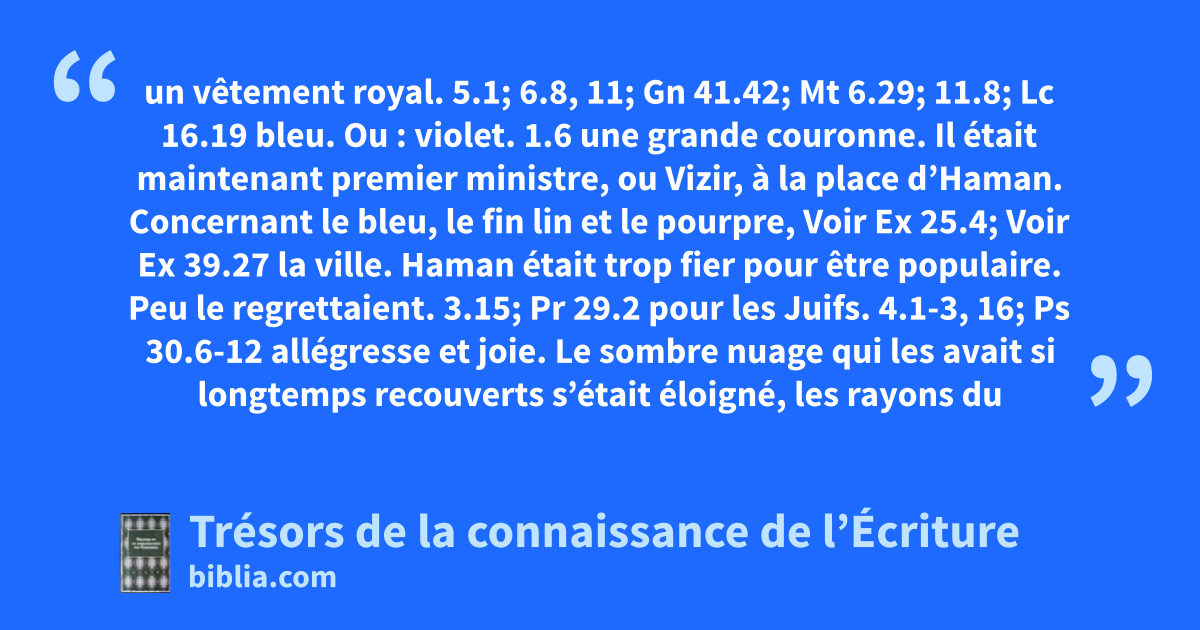 un vêtement royal. 5.1; 6.8, 11; Gn 41.42; Mt 6.29; 11.8; Lc 16.19 bleu. Ou : violet. 1.6 une grande couronne. Il était maintenant premier ministre, ou Vizir, à la place d’Haman. Concernant le bleu, le fin lin et le pourpre, Voir Ex 25.4; Voir Ex 39.27 la ville. Haman était trop fier pour être populaire. Peu le regrettaient. 3.15; Pr 29.2