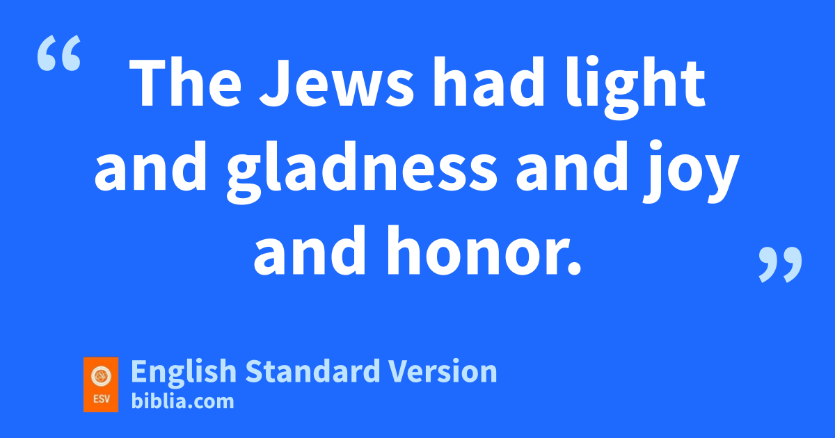15 Then Mordecai went out from the presence of the king lin royal robes of blue and white, with a great golden crown2 and ma robe of fine linen and purple, nand the city of Susa shouted and rejoiced. 16 The Jews had olight and gladness and joy and honor. 17 And in every province and in every city, wherever the king’s command and his edict reached, there was gladness and joy among the Jews, a feast and pa holiday. qAnd many from the peoples of the country declared themselves Jews, rfor fear of the Jews had fallen on them.