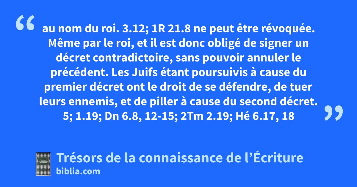 au nom du roi. 3.12; 1R 21.8 ne peut être révoquée. Même par le roi, et il est donc obligé de signer un décret contradictoire, sans pouvoir annuler le précédent. Les Juifs étant poursuivis à cause du premier décret ont le droit de se défendre, de tuer leurs ennemis, et de piller à cause du second décret. 5; 1.19; Dn 6.8, 12-15; 2Tm 2.19; Hé 6.17, 18
