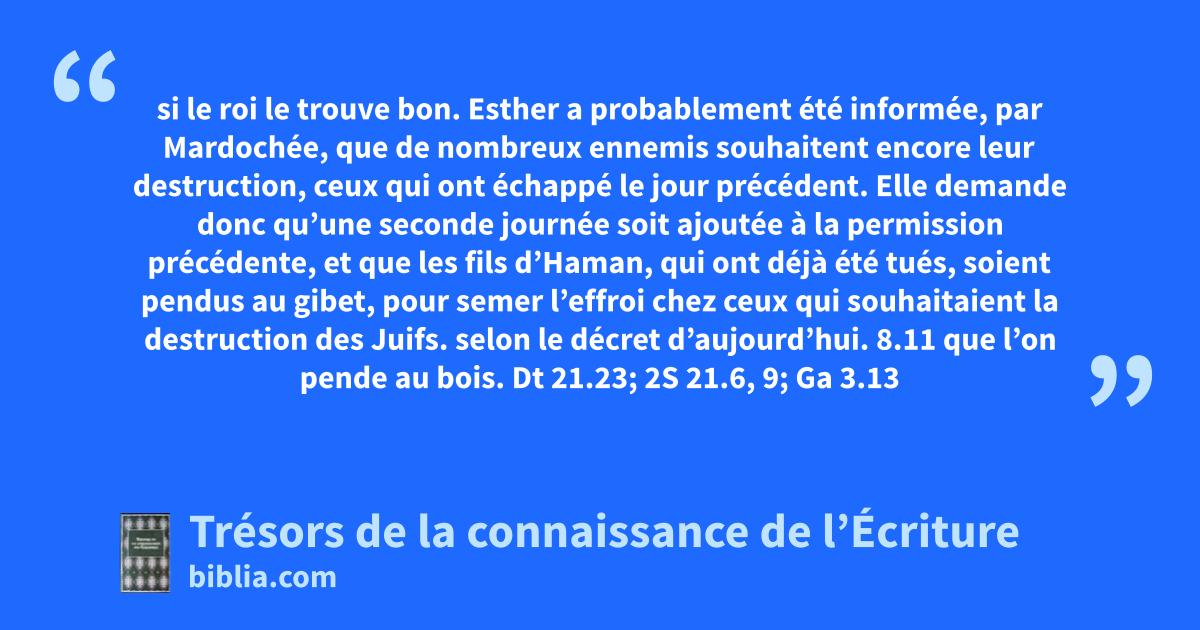 si le roi le trouve bon. Esther a probablement été informée, par Mardochée, que de nombreux ennemis souhaitent encore leur destruction, ceux qui ont échappé le jour précédent. Elle demande donc qu’une seconde journée soit ajoutée à la permission précédente, et que les fils d’Haman, qui ont déjà été tués, soient pendus au gibet, pour semer l’effroi chez ceux qui souhaitaient la destruction des Juifs. selon le décret d’aujourd’hui. 8.11 que l’on pende au bois. Dt 21.23; 2S 21.6, 9; Ga 3.13