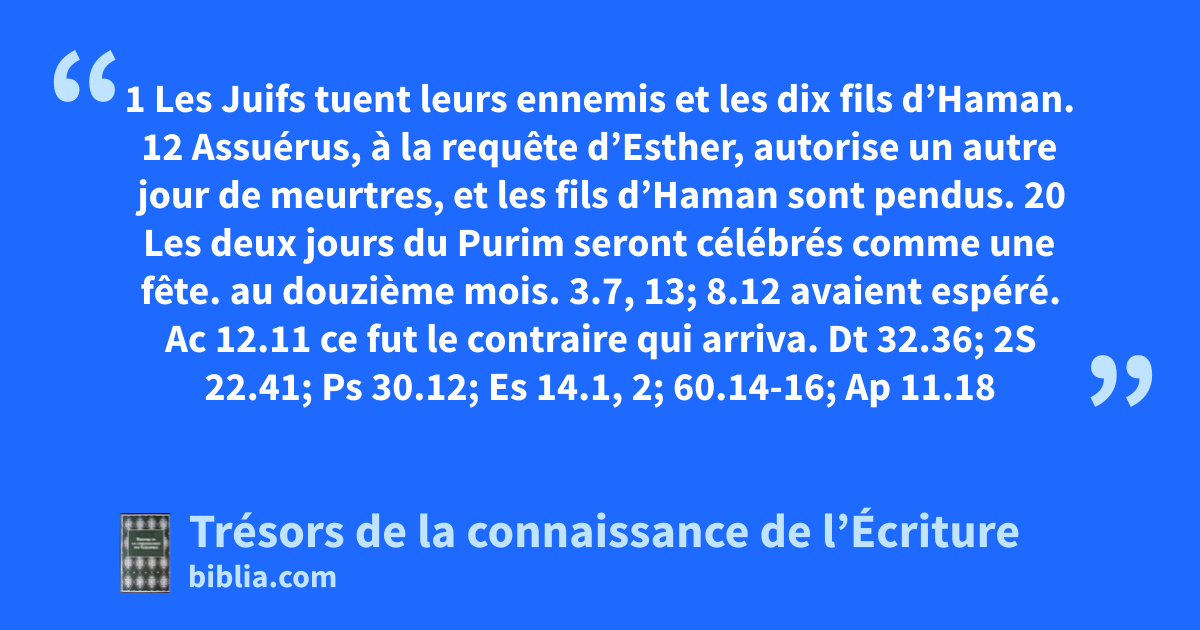 1 Les Juifs tuent leurs ennemis et les dix fils d’Haman. 12 Assuérus, à la requête d’Esther, autorise un autre jour de meurtres, et les fils d’Haman sont pendus. 20 Les deux jours du Purim seront célébrés comme une fête.