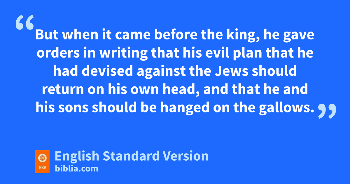 23 So the Jews accepted what they had started to do, and what Mordecai had written to them. 24 For Haman the Agagite, the son of Hammedatha, lthe enemy of all the Jews, mhad plotted against the Jews to destroy them, and nhad cast Pur (that is, cast lots), to crush and to destroy them. 25 But when it came before the king, he gave orders in writing othat his evil plan that he had devised against the Jews pshould return on his own head, and that he and his sons should be hanged on the gallows. 26 Therefore they called these days Purim, after the term nPur. Therefore, because of all that was written in qthis letter, and of what they had faced in this matter, and of what had happened to them, 27 the Jews firmly obligated themselves and their offspring and rall who joined them, that without fail they would keep sthese two days according to what was written and at the time appointed every year, 28 that these days should be remembered and kept throughout every generation, in every clan, province, and city, and that these days of Purim should never fall into disuse among the Jews, nor should the commemoration of these days cease among their descendants.