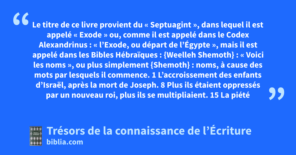 Le titre de ce livre provient du « Septuagint », dans lequel il est appelé « Exode » ou, comme il est appelé dans le Codex Alexandrinus : « l’Exode, ou départ de l’Égypte », mais il est appelé dans les Bibles Hébraïques : {Weelleh Shemoth} :
