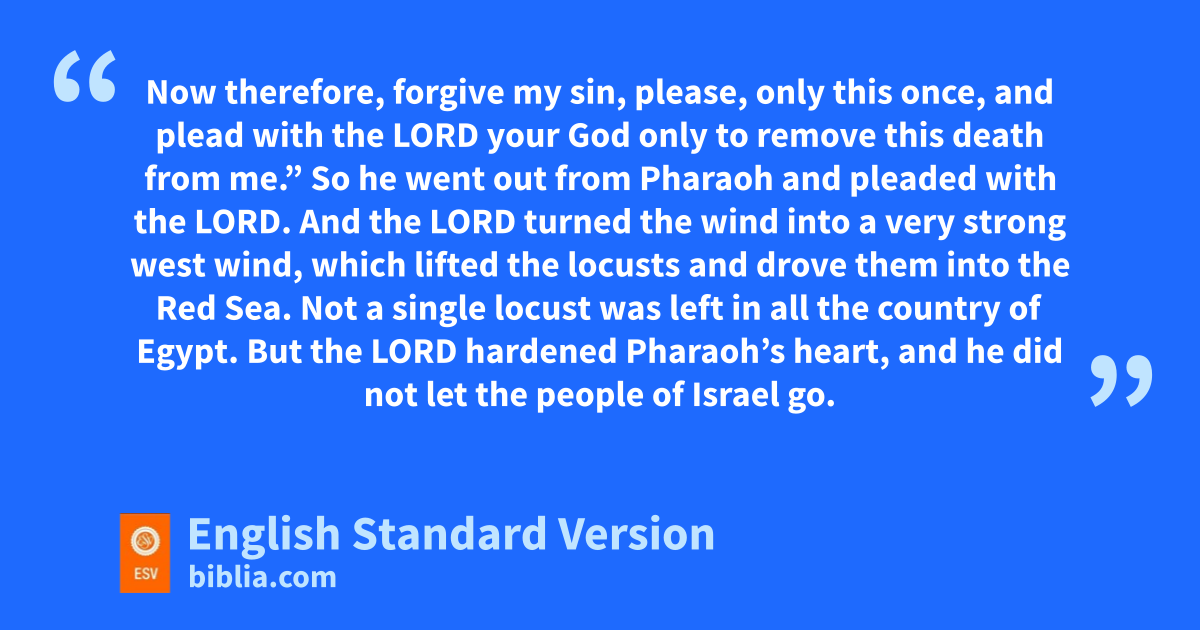 12 Then the Lord said to Moses, b“Stretch out your hand over the land of Egypt for the locusts, so that they may come upon the land of Egypt and ceat every plant in the land, all that the hail has left.” 13 So Moses stretched out his staff over the land of Egypt, and the Lord brought an east wind upon the land all that day and all that night. When it was morning, the east wind had brought the locusts. 14 dThe locusts came up over all the land of Egypt and settled on the whole country of Egypt, esuch a dense swarm of locusts as had never been before, nor ever will be again. 15 They covered the face of the whole land, so that the land was darkened, and fthey ate all the plants in the land and all the fruit of the trees that the hail had left. Not a green thing remained, neither tree nor plant of the field, through all the land of Egypt. 16 Then Pharaoh hastily called Moses and Aaron and said, g“I have sinned against the Lord your God, and against you. 17 Now therefore, forgive my sin, please, only this once, and hplead with the Lord your God only to remove this death from me.” 18 So ihe went out from Pharaoh and pleaded with the Lord. 19 And the Lord turned the wind into a very strong west wind, which lifted the locusts and drove them jinto the Red Sea. Not a single locust was left in all the country of Egypt. 20 But the Lord khardened Pharaoh’s heart, and he did not let the people of Israel go.