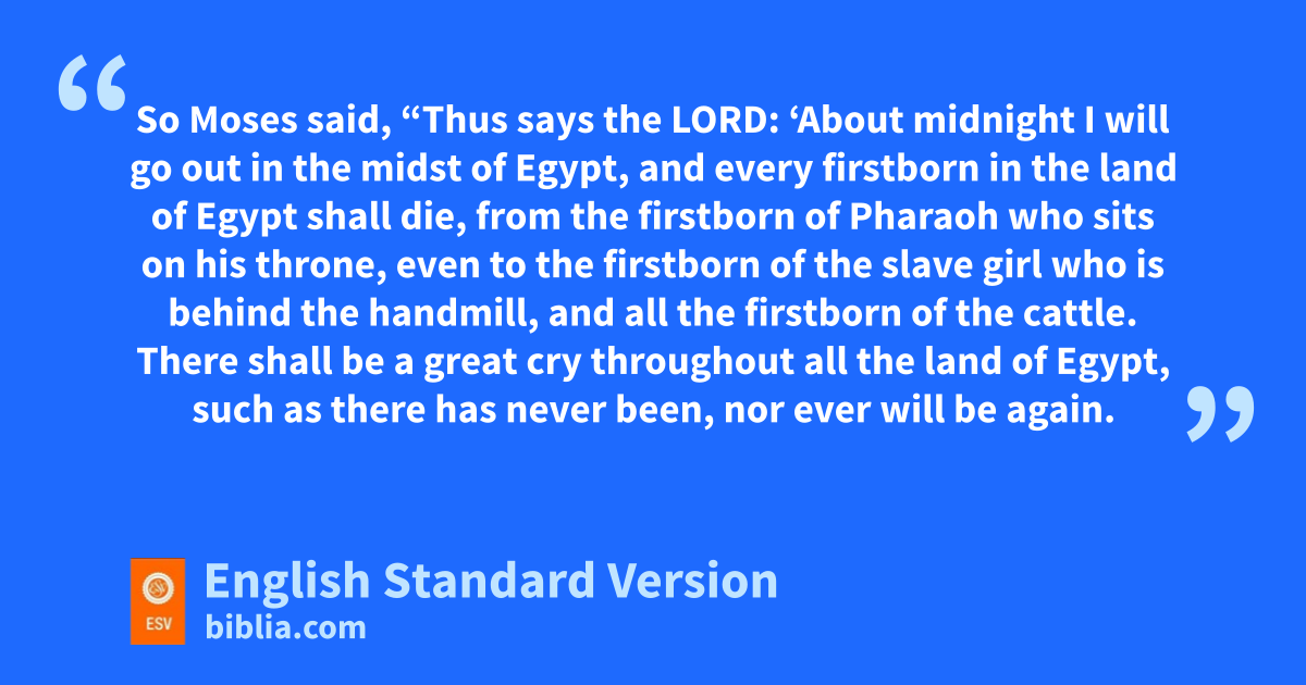 4 So Moses said, “Thus says the Lord: w‘About midnight I will go out in the midst of Egypt, 5 and every firstborn in the land of Egypt shall die, from the firstborn of Pharaoh who sits on his throne, even to the firstborn of the slave girl who is xbehind the handmill, and all the firstborn of the cattle. 6 yThere shall be a great cry throughout all the land of Egypt, such as there has never been, nor ever will be again. 7 But not a dog shall growl zagainst any of the people of Israel, either man or beast, that you may know that the Lord amakes a distinction between Egypt and Israel.’ 8 And ball these your servants shall come down to me and bow down to me, saying, ‘Get out, you and all the people who follow you.’ And after that I will go out.” And he went out from Pharaoh in hot anger. 9 Then the Lord said to Moses, c“Pharaoh will not listen to you, that dmy wonders may be multiplied in the land of Egypt.”