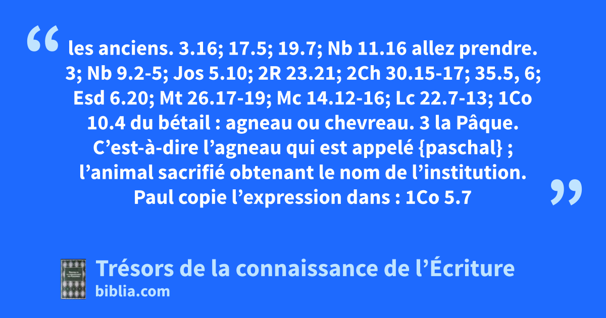 les anciens. 3.16; 17.5; 19.7; Nb 11.16 allez prendre. 3; Nb 9.2-5; Jos 5.10; 2R 23.21; 2Ch 30.15-17; 35.5, 6; Esd 6.20; Mt 26.17-19; Mc 14.12-16; Lc 22.7-13; 1Co 10.4 du bétail : agneau ou chevreau. 3 la Pâque. C’est-à-dire l’agneau qui est appelé {paschal} ; l’animal sacrifié obtenant le nom de l’institution. Paul copie l’expression dans : 1Co 5.7