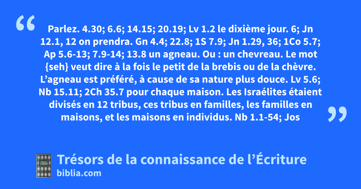 Parlez. 4.30; 6.6; 14.15; 20.19; Lv 1.2 le dixième jour. 6; Jn 12.1, 12 on prendra. Gn 4.4; 22.8; 1S 7.9; Jn 1.29, 36; 1Co 5.7; Ap 5.6-13; 7.9-14; 13.8 un agneau. Ou : un chevreau. Le mot {seh} veut dire à la fois le petit de la brebis ou de la chèvre. L’agneau est préféré, à cause de sa nature plus douce. Lv 5.6; Nb 15.11; 2Ch 35.7 pour chaque maison. Les Israélites étaient divisés en 12 tribus, ces tribus en familles, les familles en maisons, et les maisons en individus. Nb 1.1-54; Jos 7.14