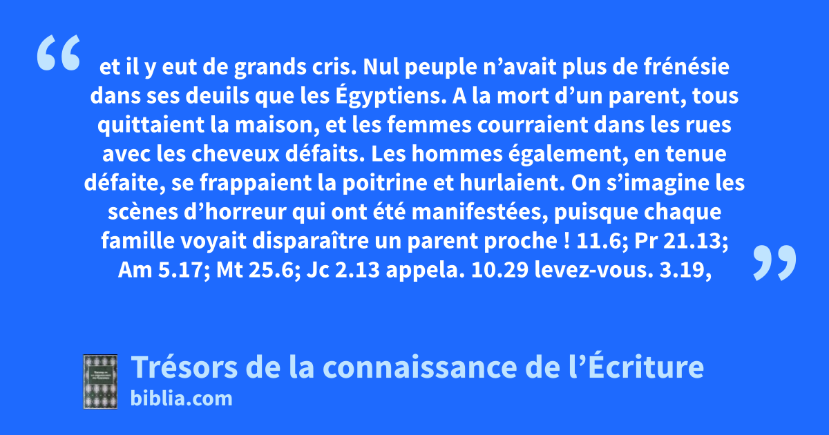 et il y eut de grands cris. Nul peuple n’avait plus de frénésie dans ses deuils que les Égyptiens. A la mort d’un parent, tous quittaient la maison, et les femmes courraient dans les rues avec les cheveux défaits. Les hommes également, en tenue défaite, se frappaient la poitrine et hurlaient. On s’imagine les scènes d’horreur qui ont été manifestées, puisque chaque famille voyait disparaître un parent proche ! 11.6; Pr 21.13; Am 5.17; Mt 25.6; Jc 2.13