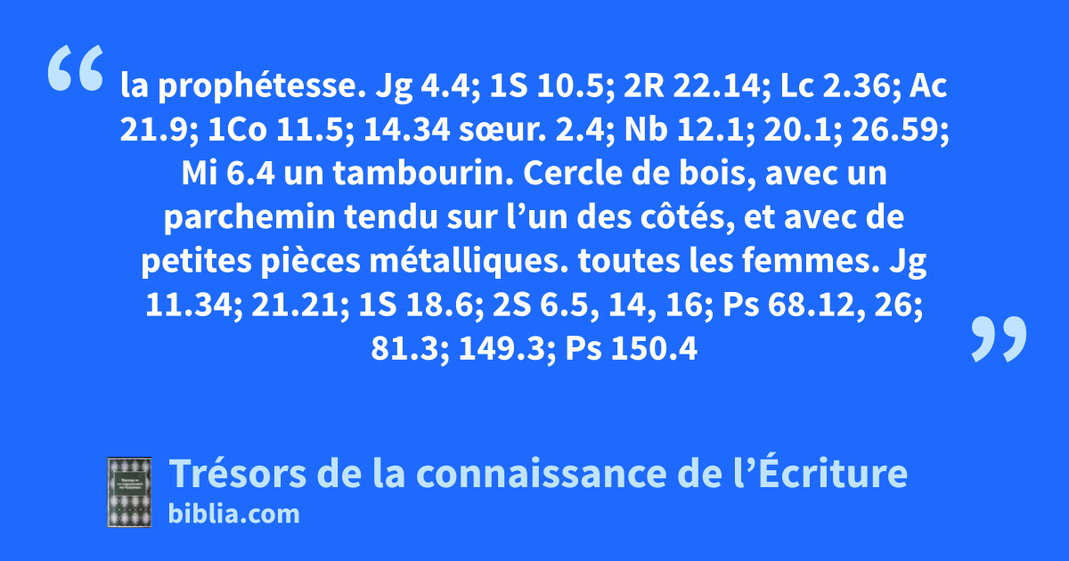 la prophétesse. Jg 4.4; 1S 10.5; 2R 22.14; Lc 2.36; Ac 21.9; 1Co 11.5; 14.34 sœur. 2.4; Nb 12.1; 20.1; 26.59; Mi 6.4 un tambourin. Cercle de bois, avec un parchemin tendu sur l’un des côtés, et avec de petites pièces métalliques. toutes les femmes. Jg 11.34; 21.21; 1S 18.6; 2S 6.5, 14, 16; Ps 68.12, 26; 81.3; 149.3; Ps 150.4