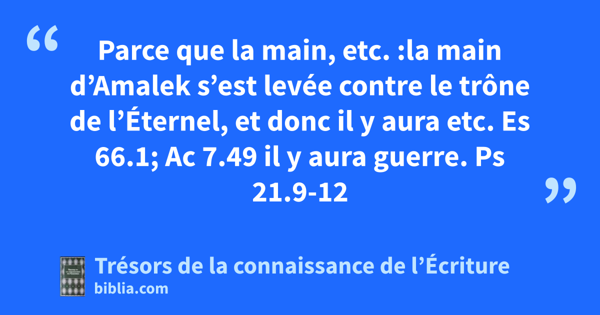 Parce que la main, etc. :la main d’Amalek s’est levée contre le trône de l’Éternel, et donc il y aura etc. Es 66.1; Ac 7.49 il y aura guerre. Ps 21.9-12