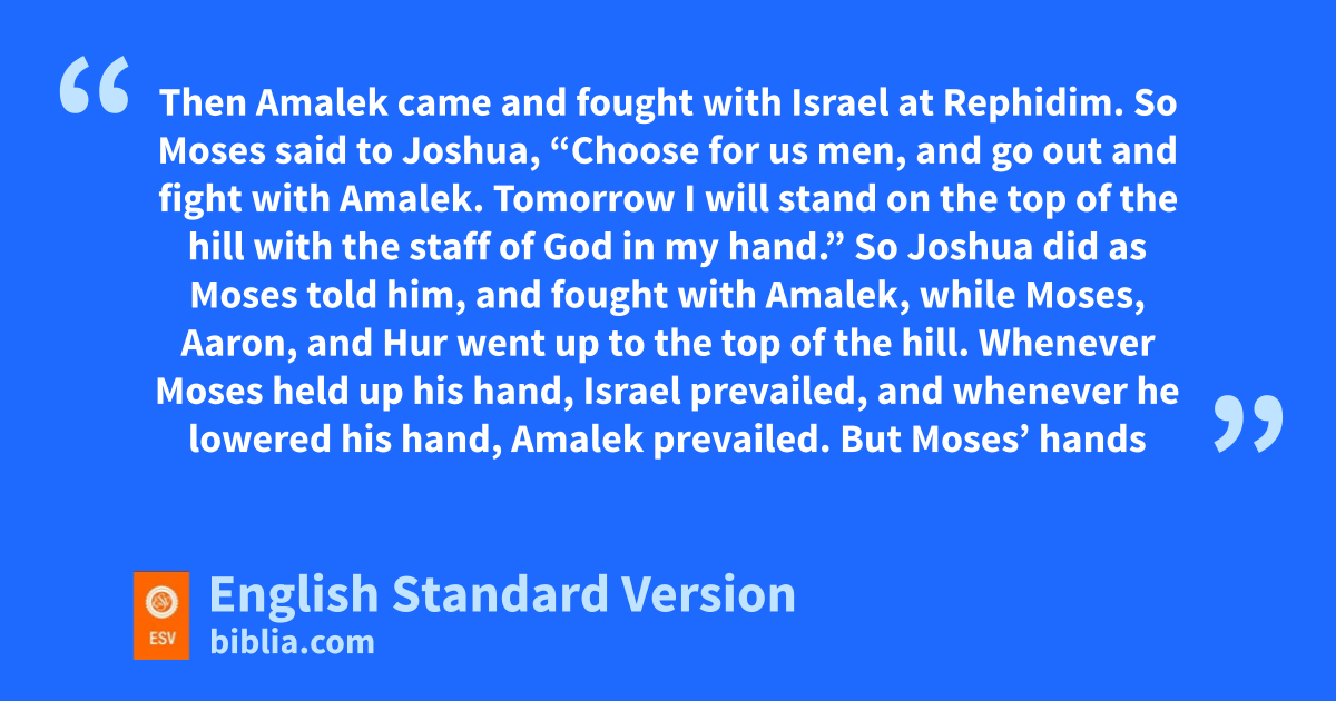 8 fThen Amalek came and fought with Israel at Rephidim. 9 So Moses said to gJoshua, “Choose for us men, and go out and fight with Amalek. Tomorrow I will stand on the top of the hill with hthe staff of God in my hand.” 10 So gJoshua did as Moses told him, and fought with Amalek, while Moses, Aaron, and iHur went up to the top of the hill. 11 Whenever Moses jheld up his hand, Israel prevailed, and whenever he lowered his hand, Amalek prevailed. 12 But Moses’ hands grew weary, so they took a stone and put it under him, and he sat on it, while Aaron and iHur held up his hands, one on one side, and the other on the other side. So his hands were steady until the going down of the sun. 13 And gJoshua overwhelmed Amalek and his people with the sword.
