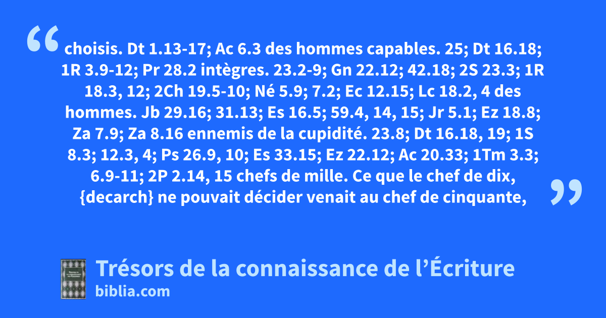 choisis. Dt 1.13-17; Ac 6.3 des hommes capables. 25; Dt 16.18; 1R 3.9-12; Pr 28.2 intègres. 23.2-9; Gn 22.12; 42.18; 2S 23.3; 1R 18.3, 12; 2Ch 19.5-10; Né 5.9; 7.2; Ec 12.15; Lc 18.2, 4 des hommes. Jb 29.16; 31.13; Es 16.5; 59.4, 14, 15; Jr 5.1; Ez 18.8; Za 7.9; Za 8.16 ennemis de la cupidité. 23.8; Dt 16.18, 19; 1S 8.3; 12.3, 4; Ps 26.9, 10; Es 33.15; Ez 22.12; Ac 20.33; 1Tm 3.3; 6.9-11; 2P 2.14, 15 chefs de mille. Ce que le chef de dix, {decarch} ne pouvait décider venait au chef de cinquante, {pentecontarch} et ainsi par étapes au chef de cent, {hecatontarch} puis au chef de mille, {chiliarch} puis à Moïse. Chaque magistrat n’avait soin que de dix hommes. Nb 10.4; Dt 1.15; Jos 22.14; 1S 8.12