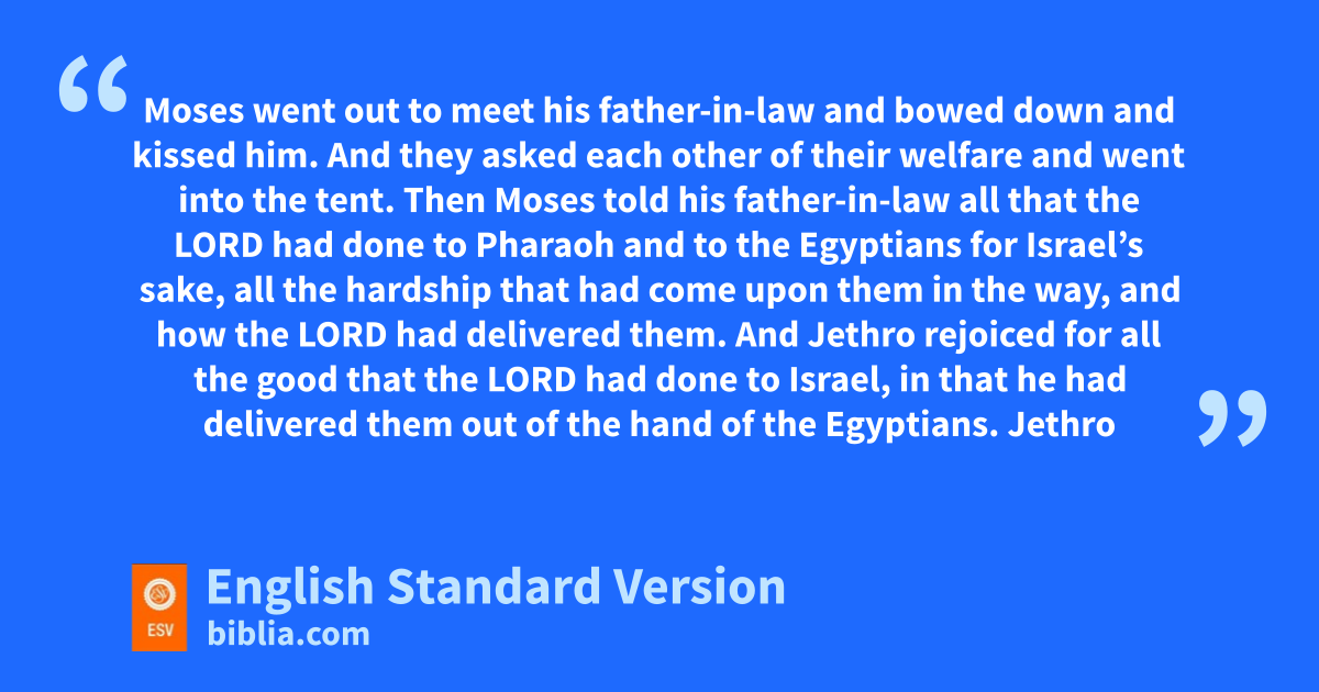 18 mJethro, nthe priest of Midian, Moses’ father-in-law, heard of all that God had done for Moses and for Israel his people, how the Lord had brought Israel out of Egypt. 2 Now Jethro, Moses’ father-in-law, had taken Zipporah, Moses’ wife, after he had sent her home, 3 along with her otwo sons. The name of the one was Gershom (pfor he said, q“I have been a sojourner1 in a foreign land”), 4 and the name of the other, Eliezer2 (for he said, “The God of my father was my help, and delivered me from the sword of Pharaoh”). 5 Jethro, Moses’ father-in-law, came with his sons and his wife to Moses in the wilderness where he was encamped at the rmountain of God. 6 And when he sent word to Moses, “I,3 your father-in-law Jethro, am coming to you with your wife and her two sons with her,” 7 Moses swent out to meet his father-in-law and bowed down and tkissed him. And they asked each other of their welfare and went into the tent. 8 Then Moses told his father-in-law uall that the Lord had done to Pharaoh and to the Egyptians for Israel’s sake, all the hardship that had come upon them in the way, and how the Lord had delivered them. 9 And Jethro rejoiced for all the good that the Lord had done to Israel, in that he had delivered them out of the hand of the Egyptians.