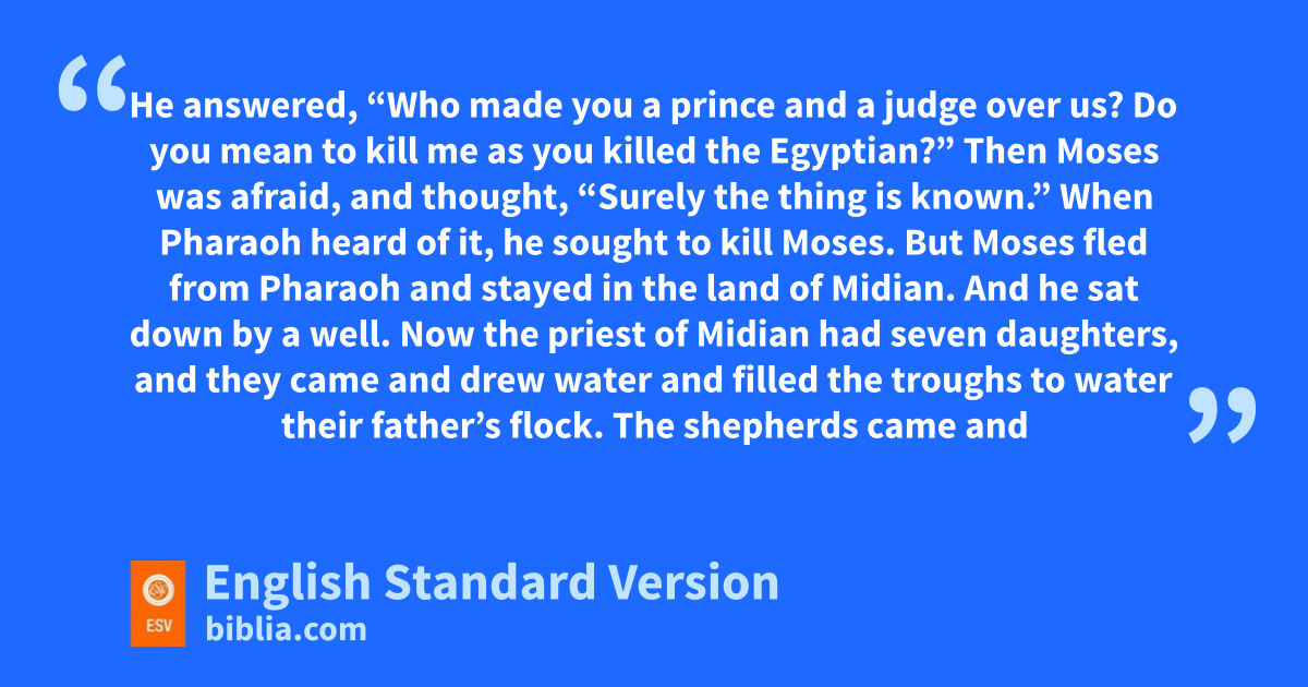 11 One day, zwhen Moses had grown up, he went out to his people and looked on their aburdens, and he saw an Egyptian beating a Hebrew, one of his people.3 12 He looked this way and that, and seeing no one, he bstruck down the Egyptian and hid him in the sand. 13 When che went out the next day, behold, two Hebrews were struggling together. And he said to the man in the wrong, “Why do you strike your companion?” 14 He answered, d“Who made you a prince and a judge over us? Do you mean to kill me as you killed the Egyptian?” Then Moses was afraid, and thought, “Surely the thing is known.” 15 When Pharaoh heard of it, he sought to kill Moses. But eMoses fled from Pharaoh and stayed in the land of Midian. And he sat down by fa well.