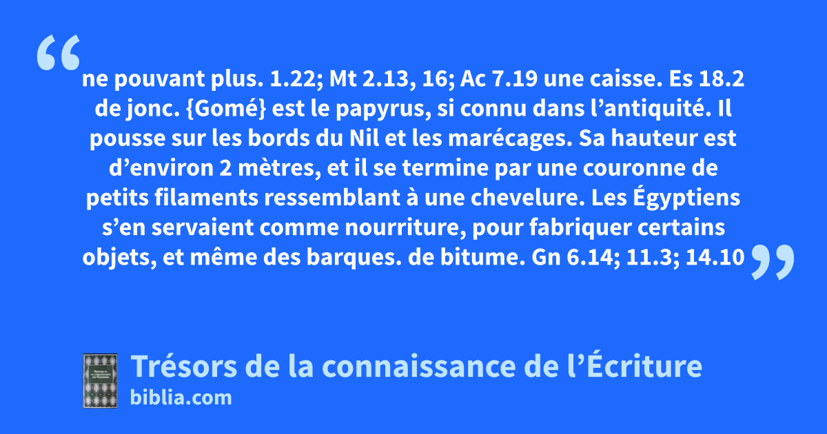 ne pouvant plus. 1.22; Mt 2.13, 16; Ac 7.19 une caisse. Es 18.2 de jonc. {Gomé} est le papyrus, si connu dans l’antiquité. Il pousse sur les bords du Nil et les marécages. Sa hauteur est d’environ 2 mètres, et il se termine par une couronne de petits filaments ressemblant à une chevelure. Les Égyptiens s’en servaient comme nourriture, pour fabriquer certains objets, et même des barques. de bitume. Gn 6.14; 11.3; 14.10