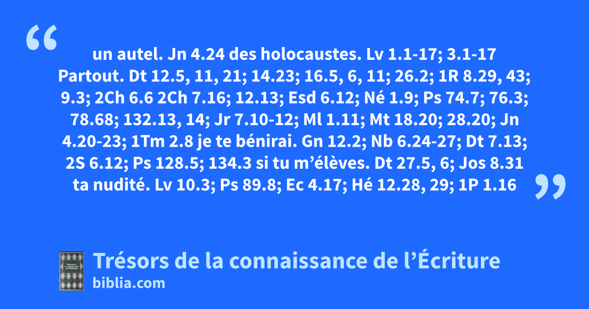 un autel. Jn 4.24 des holocaustes. Lv 1.1-17; 3.1-17 Partout. Dt 12.5, 11, 21; 14.23; 16.5, 6, 11; 26.2; 1R 8.29, 43; 9.3; 2Ch 6.6 2Ch 7.16; 12.13; Esd 6.12; Né 1.9; Ps 74.7; 76.3; 78.68; 132.13, 14; Jr 7.10-12; Ml 1.11; Mt 18.20; 28.20; Jn 4.20-23; 1Tm 2.8 je te bénirai. Gn 12.2; Nb 6.24-27; Dt 7.13; 2S 6.12; Ps 128.5; 134.3