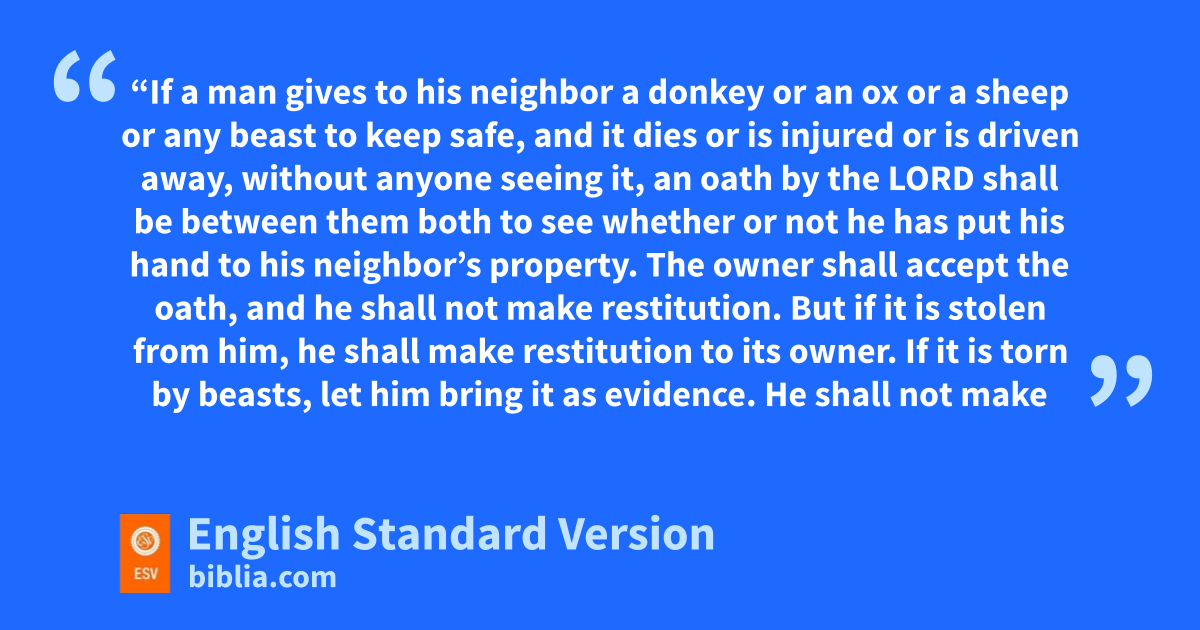 10 “If a man gives to his neighbor a donkey or an ox or a sheep or any beast to keep safe, and it dies or is injured or is driven away, without anyone seeing it, 11 han oath by the Lord shall be between them both to see whether or not he has put his hand to his neighbor’s property. The owner shall accept the oath, and he shall not make restitution. 12 But if iit is stolen from him, he shall make restitution to its owner. 13 If it is torn by beasts, let him bring it as evidence. He shall not make restitution for what has been torn.