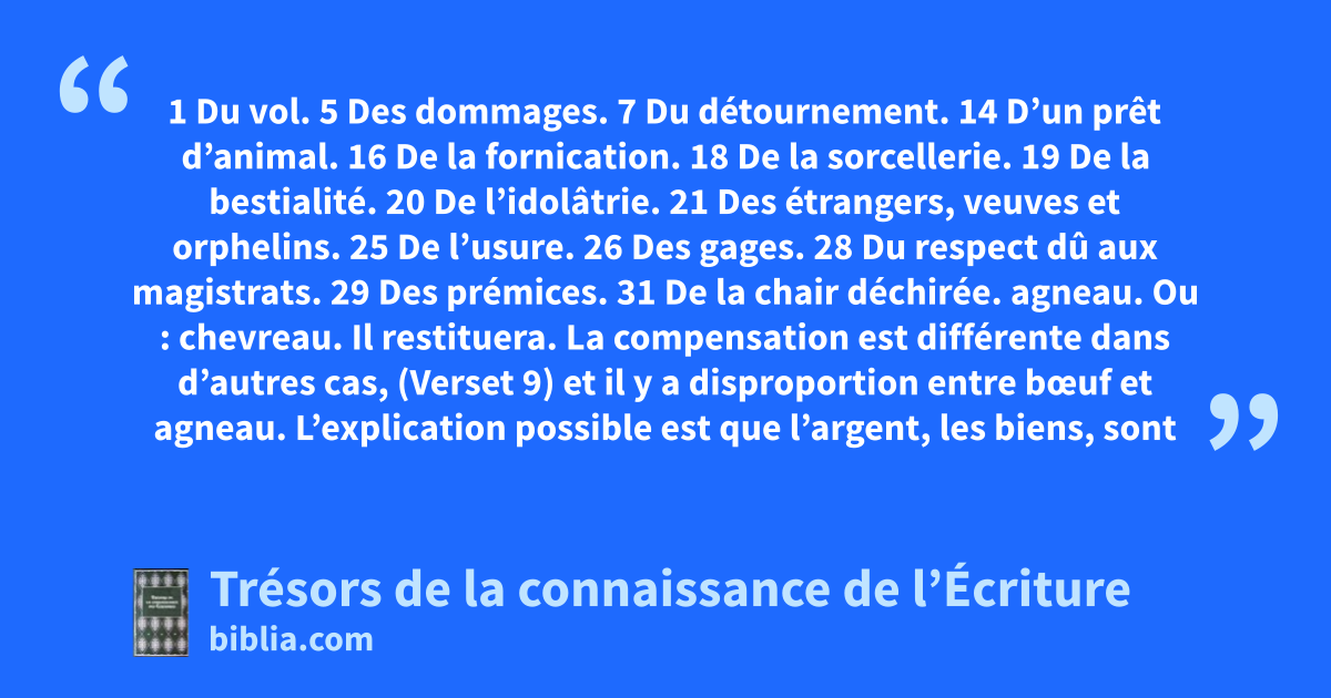 1 Du vol. 5 Des dommages. 7 Du détournement. 14 D’un prêt d’animal. 16 De la fornication. 18 De la sorcellerie. 19 De la bestialité. 20 De l’idolâtrie. 21 Des étrangers, veuves et orphelins. 25 De l’usure. 26 Des gages. 28 Du respect dû aux magistrats. 29 Des prémices. 31 De la chair déchirée.