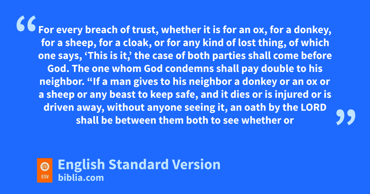 7 “If a man gives to his neighbor money or goods to keep safe, and it is stolen from the man’s house, then, if the thief is found, ghe shall pay double. 8 If the thief is not found, the owner of the house shall come near to God to show whether or not he has put his hand to his neighbor’s property. 9 For every breach of trust, whether it is for an ox, for a donkey, for a sheep, for a cloak, or for any kind of lost thing, of which one says, ‘This is it,’ the case of both parties shall come before God. The one whom God condemns shall pay double to his neighbor.