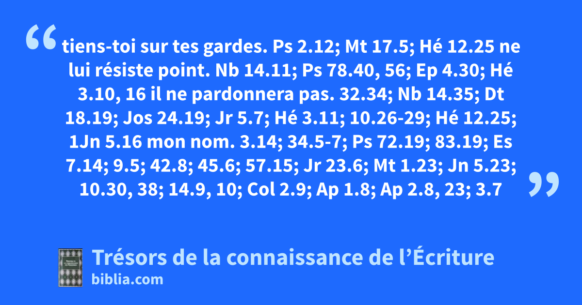 tiens-toi sur tes gardes. Ps 2.12; Mt 17.5; Hé 12.25 ne lui résiste point. Nb 14.11; Ps 78.40, 56; Ep 4.30; Hé 3.10, 16 il ne pardonnera pas. 32.34; Nb 14.35; Dt 18.19; Jos 24.19; Jr 5.7; Hé 3.11; 10.26-29; Hé 12.25; 1Jn 5.16 mon nom. 3.14; 34.5-7; Ps 72.19; 83.19; Es 7.14; 9.5; 42.8; 45.6; 57.15; Jr 23.6; Mt 1.23; Jn 5.23; 10.30, 38; 14.9, 10; Col 2.9; Ap 1.8; Ap 2.8, 23; 3.7