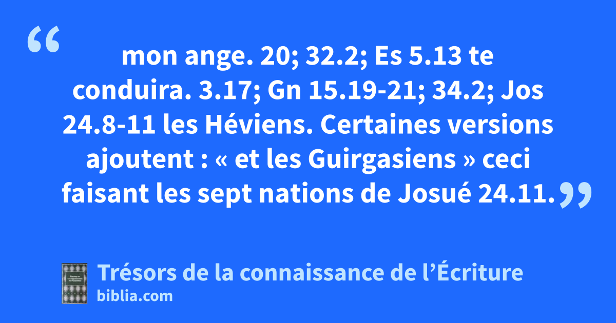 mon ange. 20; 32.2; Es 5.13 te conduira. 3.17; Gn 15.19-21; 34.2; Jos 24.8-11 les Héviens. Certaines versions ajoutent : « et les Guirgasiens » ceci faisant les sept nations de Josué 24.11.
