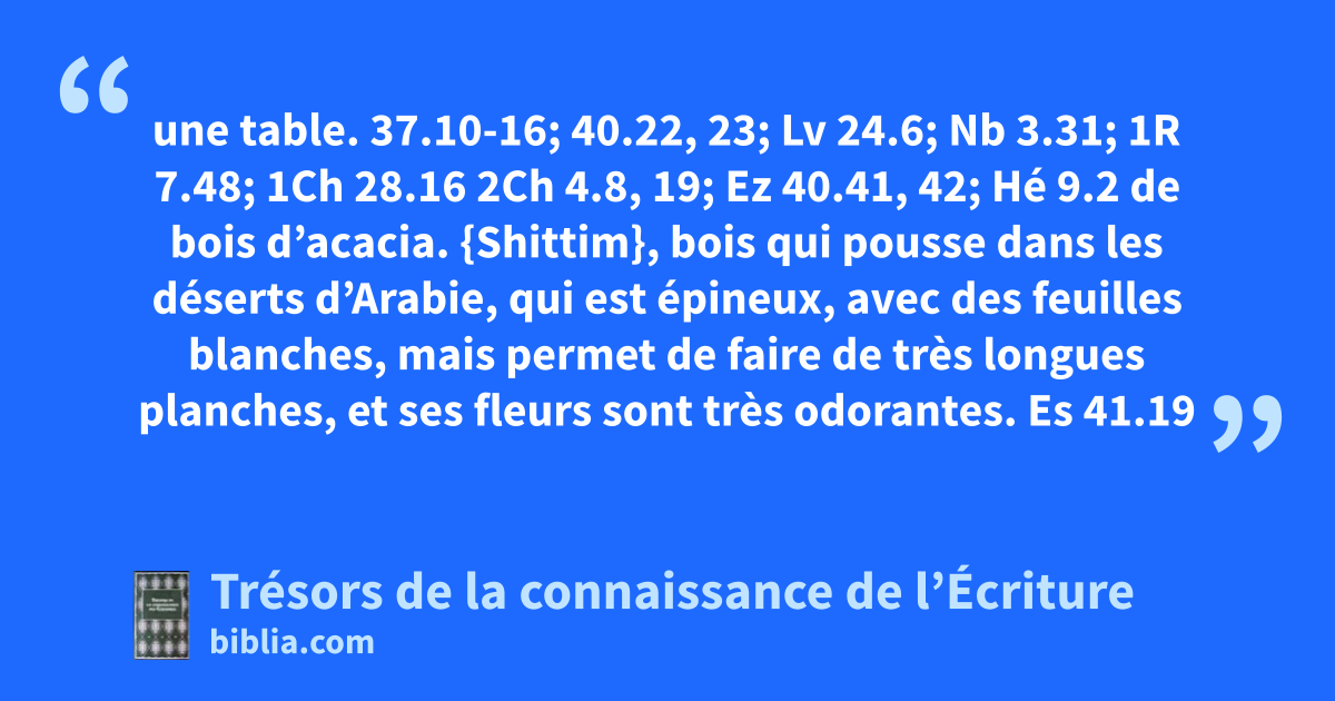 une table. 37.10-16; 40.22, 23; Lv 24.6; Nb 3.31; 1R 7.48; 1Ch 28.16 2Ch 4.8, 19; Ez 40.41, 42; Hé 9.2 de bois d’acacia. {Shittim}, bois qui pousse dans les déserts d’Arabie, qui est épineux, avec des feuilles blanches, mais permet de faire de très longues planches, et ses fleurs sont très odorantes. Es 41.19