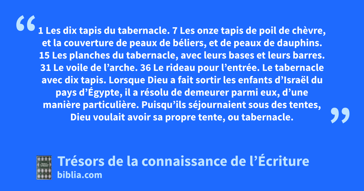 Le tabernacle avec dix tapis. Lorsque Dieu a fait sortir les enfants d’Israël du pays d’Égypte, il a résolu de demeurer parmi eux, d’une manière particulière. Puisqu’ils séjournaient sous des tentes, Dieu voulait avoir sa propre tente, ou tabernacle. Pour que cette tente soit visiblement une demeure, elle devait contenir tout ce qui est nécessaire dans une habitation, c’est-à-dire une table avec un chandelier, des plats et des assiettes, des bols, des couverts. Bien qu’il ne soit pas consommé, il fallait également du pain sur la table, et le chandelier devait être allumé en permanence. 25.8; 36.8-19; 40.2, 17-19; 1Ch 17.1; 21.29; Jn 1.14; 2.21; Hé 8.2; Hé 9.9, 23, 24; Ap 21.3 de fin lin retors. 36; 25.4; 35.6, 35; Ap 19.8 des chérubins. Voir : 25.18 travaillés. Hébreu : l’œuvre d’un brodeur.