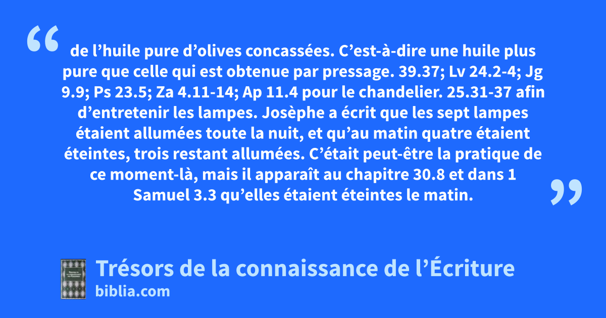 de l’huile pure d’olives concassées. C’est-à-dire une huile plus pure que celle qui est obtenue par pressage. 39.37; Lv 24.2-4; Jg 9.9; Ps 23.5; Za 4.11-14; Ap 11.4 pour le chandelier. 25.31-37 afin d’entretenir les lampes. Josèphe a écrit que les sept lampes étaient allumées toute la nuit, et qu’au matin quatre étaient éteintes, trois restant allumées. C’était peut-être la pratique de ce moment-là, mais il apparaît au chapitre 30.8 et dans 1 Samuel 3.3 qu’elles étaient éteintes le matin. Ex 30.8; 1S 3.3