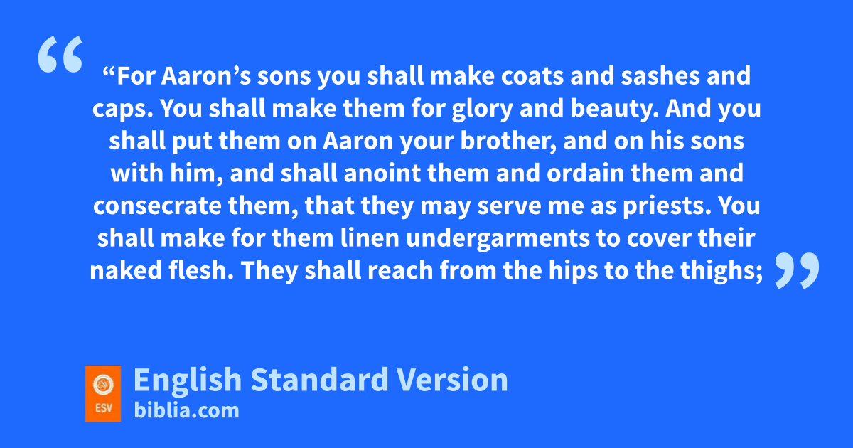 40 u“For Aaron’s sons you shall make coats and sashes and caps. You shall make them vfor glory and beauty. 41 And you shall put them on Aaron your brother, and on his sons with him, and shall wanoint them and ordain them and xconsecrate them, that they may serve me as priests. 42 You shall make for them ylinen undergarments to cover their naked flesh. They shall reach from the hips to the thighs; 43 and they shall be on Aaron and on his sons when they go into the tent of meeting or when they come near the altar to minister in the Holy Place, lest they zbear guilt and die. aThis shall be a statute forever for him and for his offspring after him.