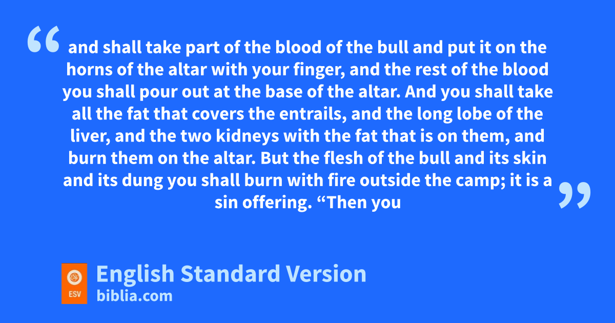 10 “Then you shall bring the bull before the tent of meeting. mAaron and his sons shall lay their hands on the head of the bull. 11 Then you shall kill the bull before the Lord at the entrance of the tent of meeting, 12 and nshall take part of the blood of the bull and put it on the ohorns of the altar with your finger, and the rest of1 the blood you shall pour out at the base of the altar. 13 And you shall take all pthe fat that covers the entrails, and the long lobe of the liver, and the two kidneys with the fat that is on them, and burn them on the altar. 14 But the flesh of the bull and its skin and its dung you shall burn with fire qoutside the camp; rit is a sin offering.