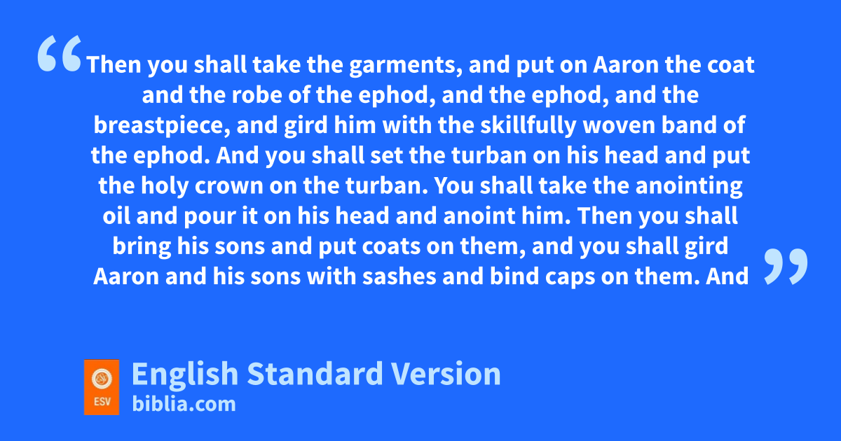 29 “Now this is what you shall do to them to consecrate them, that they may serve me as priests. bTake one bull of the herd and two rams without blemish, 2 cand unleavened bread, unleavened cakes mixed with oil, and unleavened wafers smeared with oil. You shall make them of fine wheat flour. 3 You shall put them in one basket and bring them in the basket, and bring the bull and the two rams. 4 You shall bring Aaron and his sons to the entrance of the tent of meeting and dwash them with water. 5 Then eyou shall take the garments, and put on Aaron the coat and the robe of the ephod, and the ephod, and the breastpiece, and gird him with the fskillfully woven band of the ephod. 6 gAnd you shall set the turban on his head and put the holy crown on the turban. 7 You shall take hthe anointing oil and pour it on his head and anoint him. 8 Then you ishall bring his sons and put coats on them, 9 and you shall gird Aaron and his sons with jsashes and bind caps on them. And kthe priesthood shall be theirs by a statute forever. Thus you shall lordain Aaron and his sons.