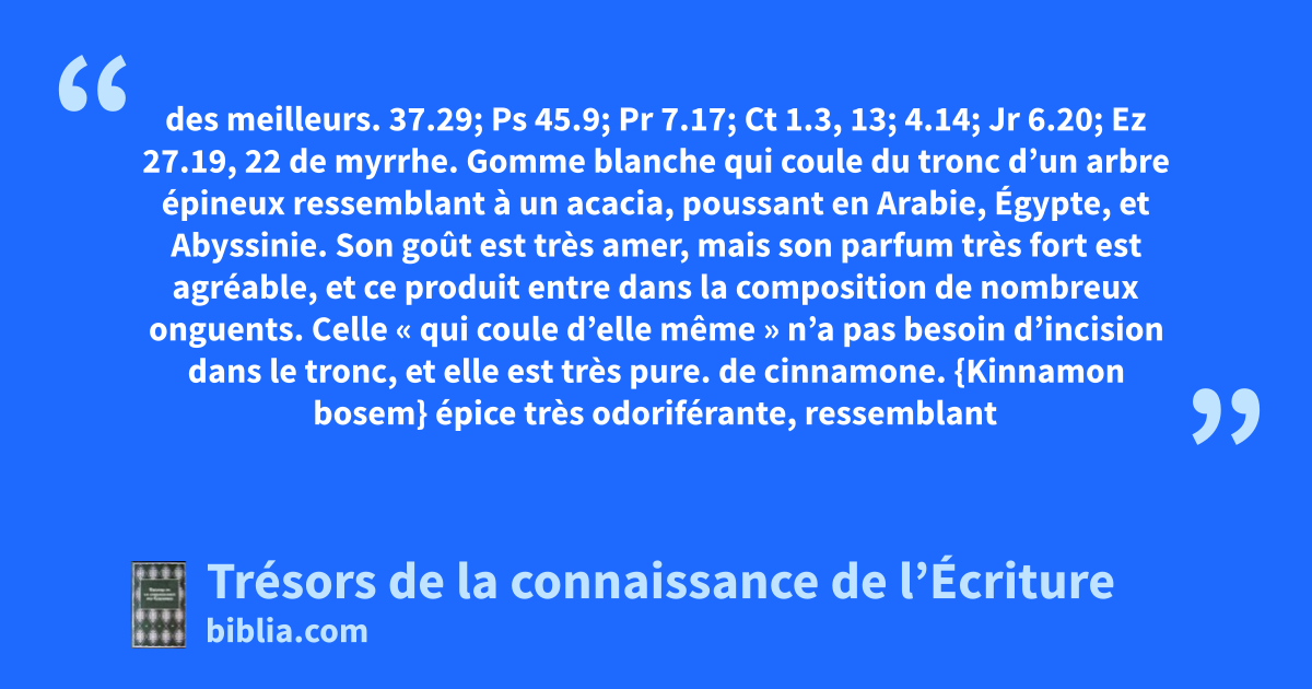 des meilleurs. 37.29; Ps 45.9; Pr 7.17; Ct 1.3, 13; 4.14; Jr 6.20; Ez 27.19, 22 de myrrhe. Gomme blanche qui coule du tronc d’un arbre épineux ressemblant à un acacia, poussant en Arabie, Égypte, et Abyssinie. Son goût est très amer, mais son parfum très fort est agréable, et ce produit entre dans la composition de nombreux onguents. Celle « qui coule d’elle même » n’a pas besoin d’incision dans le tronc, et elle est très pure. de cinnamone. {Kinnamon bosem} épice très odoriférante, ressemblant à la cannelle qui pousse sur l’île de Ceylan. de roseau aromatique. {Kenaih bosem} {calamus aromaticus} est un roseau qui pousse en Égypte. Cette plante parfume l’air lorsqu’elle est sur pied, et permet la réalisation de parfums lorsqu’elle est coupée et séchée.