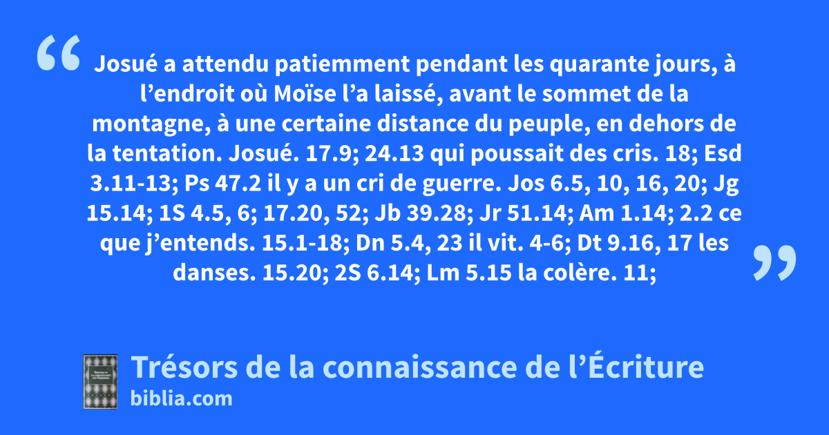 Josué a attendu patiemment pendant les quarante jours, à l’endroit où Moïse l’a laissé, avant le sommet de la montagne, à une certaine distance du peuple, en dehors de la tentation. Josué. 17.9; 24.13 qui poussait des cris. 18; Esd 3.11-13; Ps 47.2 il y a un cri de guerre. Jos 6.5, 10, 16, 20; Jg 15.14; 1S 4.5, 6; 17.20, 52; Jb 39.28; Jr 51.14; Am 1.14; 2.2