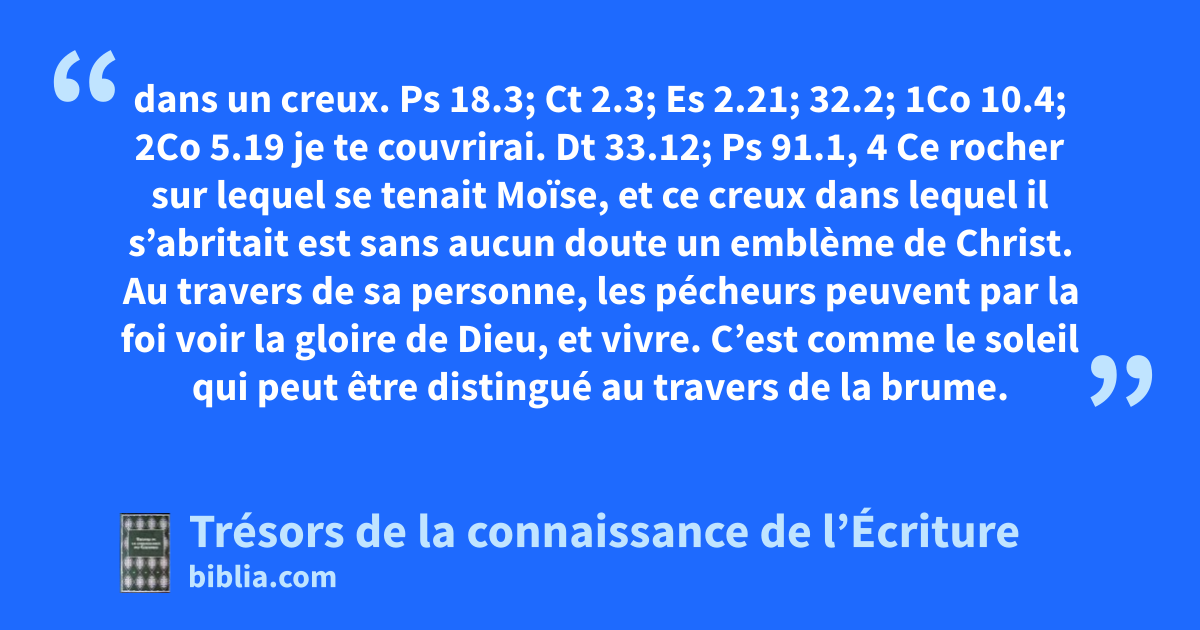 dans un creux. Ps 18.3; Ct 2.3; Es 2.21; 32.2; 1Co 10.4; 2Co 5.19 je te couvrirai. Dt 33.12; Ps 91.1, 4 Ce rocher sur lequel se tenait Moïse, et ce creux dans lequel il s’abritait est sans aucun doute un emblème de Christ. Au travers de sa personne, les pécheurs peuvent par la foi voir la gloire de Dieu, et vivre. C’est comme le soleil qui peut être distingué au travers de la brume.