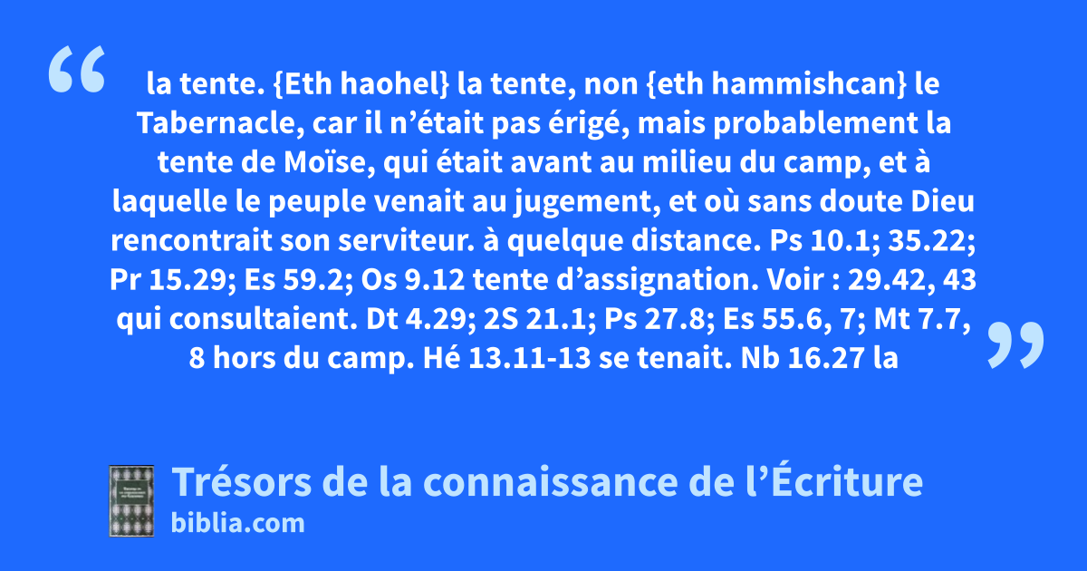 la tente. {Eth haohel} la tente, non {eth hammishcan} le Tabernacle, car il n’était pas érigé, mais probablement la tente de Moïse, qui était avant au milieu du camp, et à laquelle le peuple venait au jugement, et où sans doute Dieu rencontrait son serviteur. à quelque distance. Ps 10.1; 35.22; Pr 15.29; Es 59.2; Os 9.12 tente d’assignation. Voir : 29.42, 43 qui consultaient. Dt 4.29; 2S 21.1; Ps 27.8; Es 55.6, 7; Mt 7.7, 8 hors du camp. Hé 13.11-13
