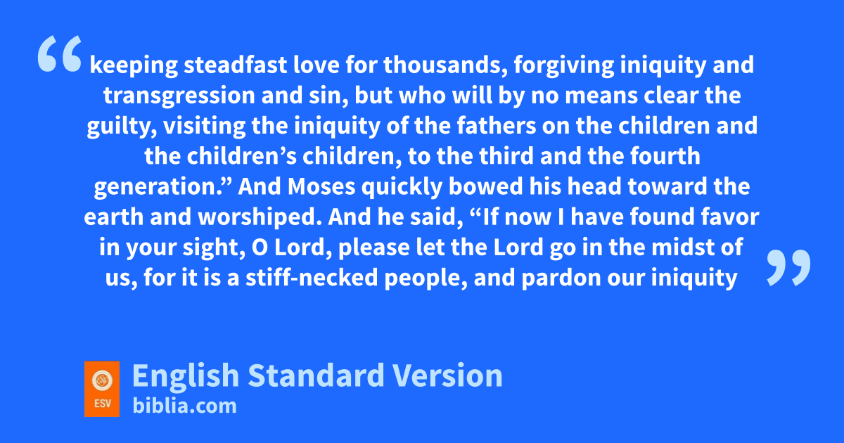 34 The Lord said to Moses, w“Cut for yourself two tablets of stone like the first, xand I will write on the tablets the words that were on the first tablets, ywhich you broke. 2 Be ready by the morning, and come up in the morning to Mount Sinai, and present yourself there to me zon the top of the mountain. 3 No aone shall come up with you, and let no one be seen throughout all the mountain. Let no flocks or herds graze opposite that mountain.” 4 So Moses cut two tablets of stone like the first. And he rose early in the morning and went up on Mount Sinai, as the Lord had commanded him, and took in his hand two tablets of stone. 5 The Lord bdescended in the cloud and stood with him there, and cproclaimed the name of the Lord. 6 The Lord passed before him and proclaimed, d“The Lord, the Lord, a God merciful and egracious, slow to anger, and abounding in steadfast flove and faithfulness, 7 gkeeping steadfast love for thousands,1 hforgiving iniquity and transgression and sin, but iwho will by no means clear the guilty, jvisiting the iniquity of the fathers on the children and the children’s children, to the third and the fourth generation.” 8 And Moses quickly kbowed his head toward the earth and worshiped. 9 And he said, “If now I have found favor in your sight, O Lord, please llet the Lord go in the midst of us, for mit is a stiff-necked people, and pardon our iniquity and our sin, and take us for nyour inheritance.”