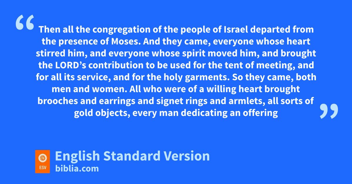 20 Then all the congregation of the people of Israel departed from the presence of Moses. 21 And they came, yeveryone whose heart stirred him, and everyone whose spirit moved him, zand brought the Lord’s contribution to be used for the tent of meeting, and for all its service, and for the holy garments. 22 So they came, both men and women. All who were of a willing heart brought brooches and earrings and signet rings and armlets, all sorts of gold objects, every man dedicating an offering of gold to the Lord. 23 And aevery one who possessed bblue or purple or scarlet yarns or fine linen or goats’ hair or tanned rams’ skins or goatskins brought them. 24 cEveryone who could make a contribution of silver or bronze brought it as the Lord’s contribution. And every one who possessed acacia wood of any use in the work brought it. 25 And every dskillful woman spun with her hands, and they all brought what they had spun in blue and purple and scarlet yarns and fine twined linen. 26 All the women ywhose hearts stirred them to use their skill spun the goats’ hair. 27 And the eleaders brought onyx stones and stones to be set, for the ephod and for the breastpiece, 28 and spices and oil for the light, and for the anointing oil, and for the fragrant incense. 29 fAll the men and women, the people of Israel, whose heart moved them to bring anything for the work that the Lord had commanded by Moses to be done brought it as a freewill offering to the Lord.