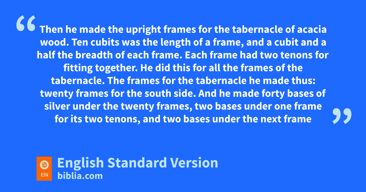 20 pThen he made the upright frames for the tabernacle of qacacia wood. 21 Ten cubits was the length of a frame, and a cubit and a half the breadth of each frame. 22 Each frame had two tenons for fitting together. He did this for all the frames of the tabernacle. 23 The frames for the tabernacle he made thus: twenty frames for the south side. 24 And he made forty bases of silver under the twenty frames, two bases under one frame for its two tenons, and two bases under the next frame for its two tenons. 25 For the second side of the tabernacle, on the north side, he made twenty frames 26 and their forty bases of silver, two bases under one frame and two bases under the next frame. 27 For the rear of the tabernacle westward he made six frames. 28 He made two frames for corners of the tabernacle in the rear. 29 And they were separate beneath but joined at the top, at the first ring. He made two of them this way for the two corners. 30 There were eight frames with their bases of silver: sixteen bases, under every frame two bases.