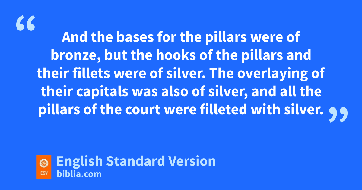 9 cAnd he made the court. For the south side the hangings of the court were of fine twined linen, a hundred cubits; 10 their twenty pillars and their twenty bases were of bronze, but the hooks of the pillars and their fillets were of silver. 11 And for the north side there were hangings of a hundred cubits; their twenty pillars and their twenty bases were of bronze, but the hooks of the pillars and their fillets were of silver. 12 And for the west side were hangings of fifty cubits, their ten pillars, and their ten bases; the hooks of the pillars and their fillets were of silver. 13 And for the front to the east, fifty cubits. 14 The hangings for one side of the gate were fifteen cubits, with their three pillars and three bases. 15 And so for the other side. On both sides of the gate of the court were hangings of fifteen cubits, with their three pillars and their three bases. 16 All the hangings around the court were of fine twined linen. 17 And the bases for the pillars were of bronze, but the hooks of the pillars and their fillets were of silver. The overlaying of their capitals was also of silver, and all the pillars of the court were filleted with silver. 18 And the screen for the gate of the court was embroidered with needlework in blue and purple and scarlet yarns and fine twined linen. It was twenty cubits long and five cubits high in its breadth, corresponding to the hangings of the court. 19 And their pillars were four in number. Their four bases were of bronze, their hooks of silver, and the overlaying of their capitals and their fillets of silver. 20 And all the pegs for the tabernacle and for the court all around were of bronze.