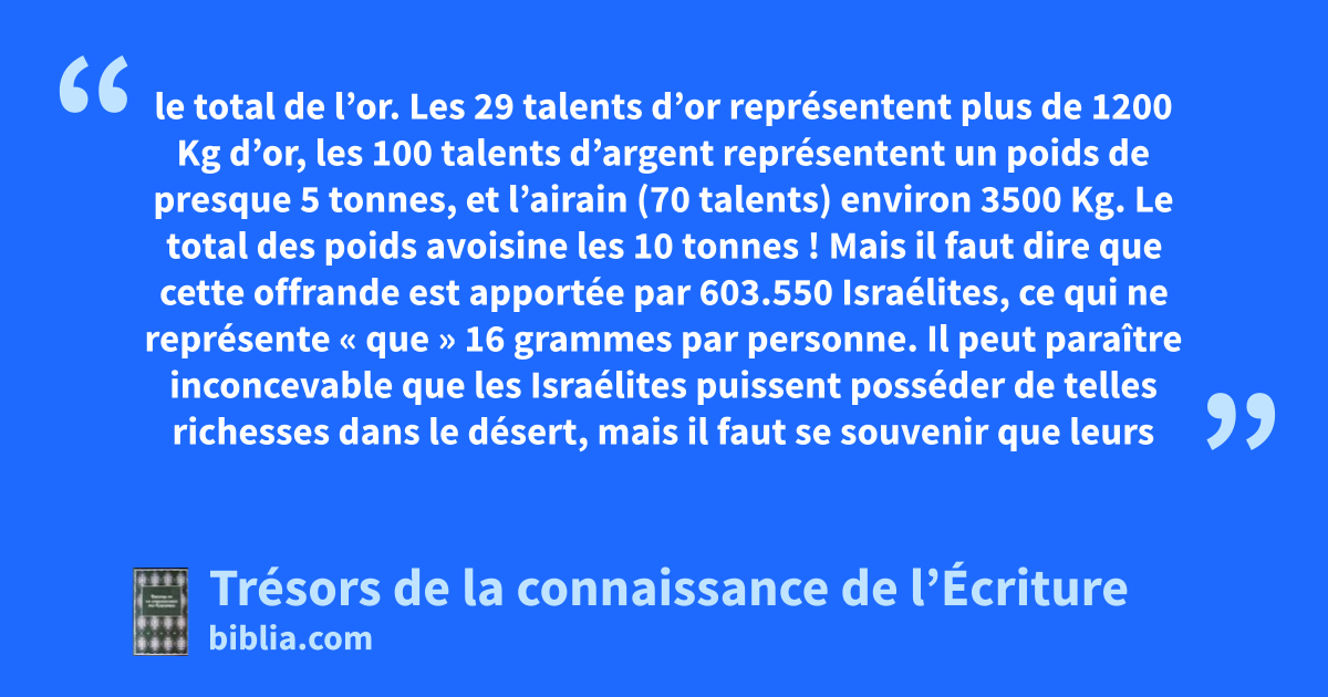 le total de l’or. Les 29 talents d’or représentent plus de 1200 Kg d’or, les 100 talents d’argent représentent un poids de presque 5 tonnes, et l’airain (70 talents) environ 3500 Kg. Le total des poids avoisine les 10 tonnes ! Mais il faut dire que cette offrande est apportée par 603.550 Israélites, ce qui ne représente « que » 16 grammes par personne. Il peut paraître inconcevable que les Israélites puissent posséder de telles richesses dans le désert, mais il faut se souvenir que leurs ancêtres étaient des gens opulents avant qu’ils n’arrivent en Égypte, puis qu’ils se sont encore enrichis en pillant les Égyptiens et les Amalécites. Il est aussi probable qu’ils ont fait du commerce avec les nations proches du désert. Trois raisons peuvent être avancées pour que de telles richesses aient été employées à la construction du tabernacle : 1. Pour graver dans l’esprit du peuple la gloire et la dignité de la Majesté Divine et l’importance du service. 2. Pour enlever de leurs mains des occasions de convoitise. 3. Pour prévenir orgueil et vaine gloire, en les conduisant à donner au service divin même leurs propres ornements. 1Ch 22.14-16; 29.2-7; Ag 2.8 des offrandes. 25.2; 29.24; 35.22 le sicle. 30.13, 14, 24; Lv 5.15; 27.3, 25; Nb 3.47; 18.16