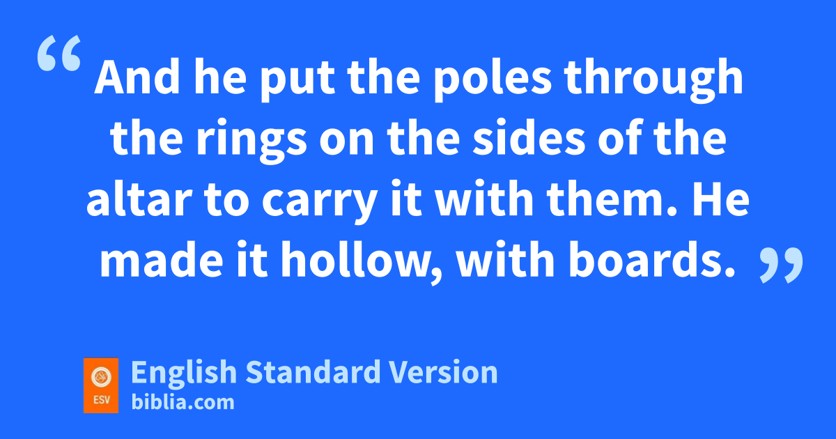 38 zHe made the altar of burnt offering of acacia wood. Five cubits1 was its length, and five cubits its breadth. It was square, and three cubits was its height. 2 He made horns for it on its four corners. Its horns were of one piece with it, and he overlaid it with bronze. 3 And he made all the utensils of the altar, the pots, the shovels, the basins, the forks, and the fire pans. He made all its utensils of bronze. 4 And he made for the altar a grating, a network of bronze, under its ledge, extending halfway down. 5 He cast four rings on the four corners of the bronze grating as holders for the poles. 6 He made the poles of acacia wood and overlaid them with bronze. 7 And he put the poles through the rings on the sides of the altar to carry it with them. He made it hollow, with boards.