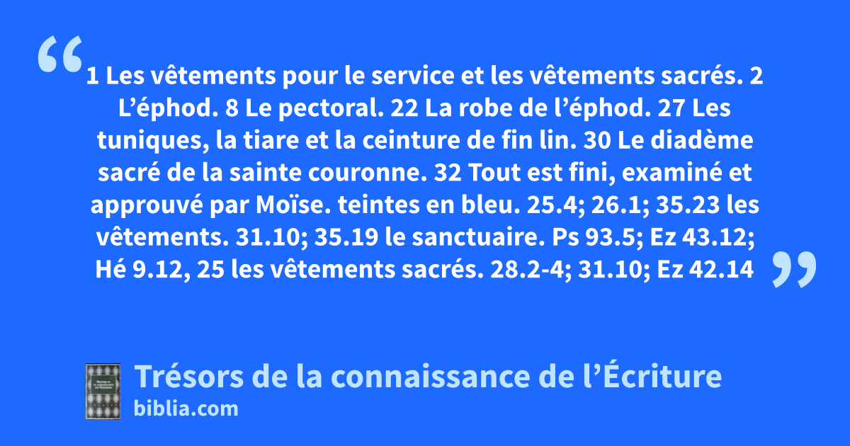 1 Les vêtements pour le service et les vêtements sacrés. 2 L’éphod. 8 Le pectoral. 22 La robe de l’éphod. 27 Les tuniques, la tiare et la ceinture de fin lin. 30 Le diadème sacré de la sainte couronne. 32 Tout est fini, examiné et approuvé par Moïse.