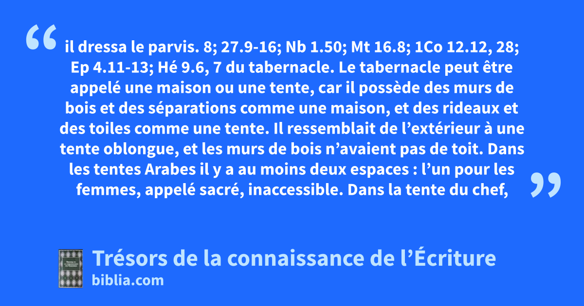 il dressa le parvis. 8; 27.9-16; Nb 1.50; Mt 16.8; 1Co 12.12, 28; Ep 4.11-13; Hé 9.6, 7 du tabernacle. Le tabernacle peut être appelé une maison ou une tente, car il possède des murs de bois et des séparations comme une maison, et des rideaux et des toiles comme une tente. Il ressemblait de l’extérieur à une tente oblongue, et les murs de bois n’avaient pas de toit. Dans les tentes Arabes il y a au moins deux espaces : l’un pour les femmes, appelé sacré, inaccessible. Dans la tente du chef, un {emir} un espace n’est accessible qu’à lui-même ou aux hôtes de marque. Une autre partie de la tente peut être éventuellement ouverte à d’autres. Ceci donne une idée bien faible de la magnifique tente royale de l’Éternel, le Roi et le Dieu des Hébreux. il mit le rideau. Jn 10.9; 14.6; Ep 2.18; Hé 4.14-16 ce fut ainsi que Moïse. 39.32; 1R 6.9; Za 4.9; Jn 4.34; 17.4; 2Tm 4.7; Hé 3.2-5