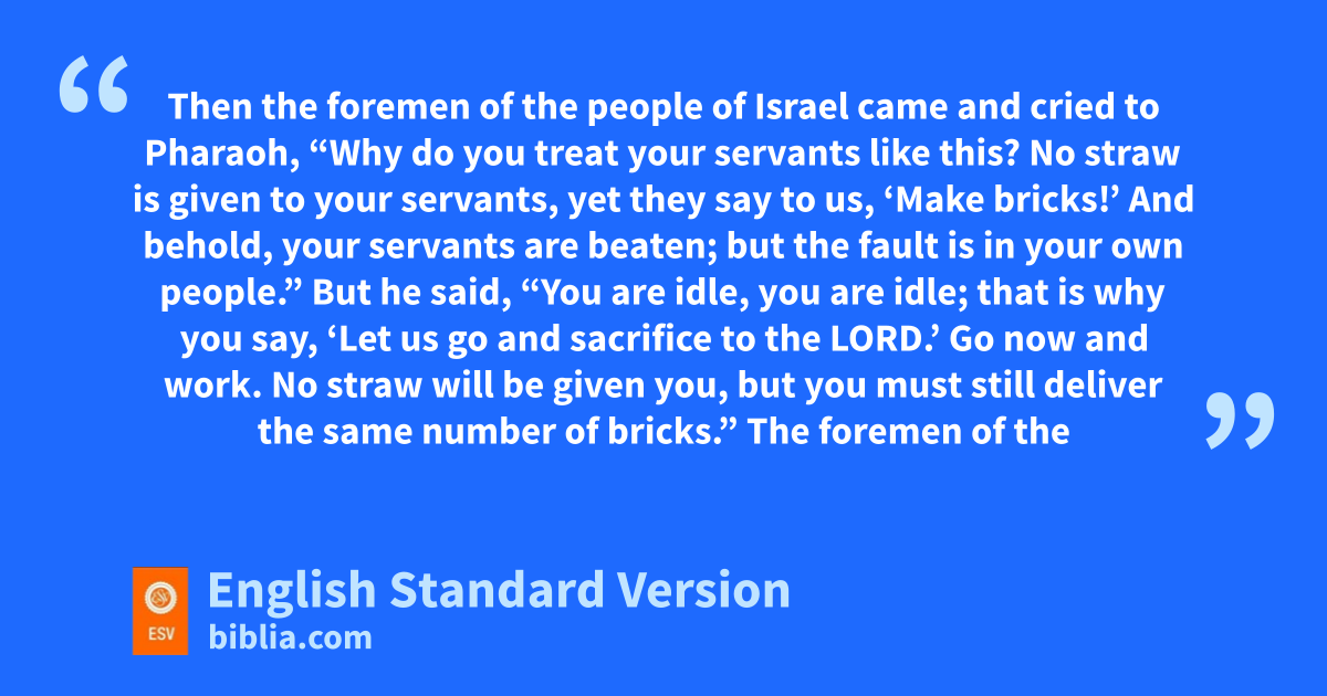 15 Then the foremen of the people of Israel came and cried to Pharaoh, “Why do you treat your servants like this? 16 No straw is given to your servants, yet they say to us, ‘Make bricks!’ And behold, your servants are beaten; but the fault is in your own people.” 17 But he said, “You are idle, you are idle; that is why you say, ‘Let us go and sacrifice to the Lord.’ 18 Go now and work. No straw will be given you, but you must still deliver the same number of bricks.” 19 The foremen of the people of Israel saw that they were in trouble when they said, “You shall by no means reduce your number of bricks, your daily task each day.” 20 They met Moses and Aaron, who were waiting for them, as they came out from Pharaoh; 21 and dthey said to them, “The Lord look on you and judge, because you have made us stink in the sight of Pharaoh and his servants, and have put a sword in their hand to kill us.”