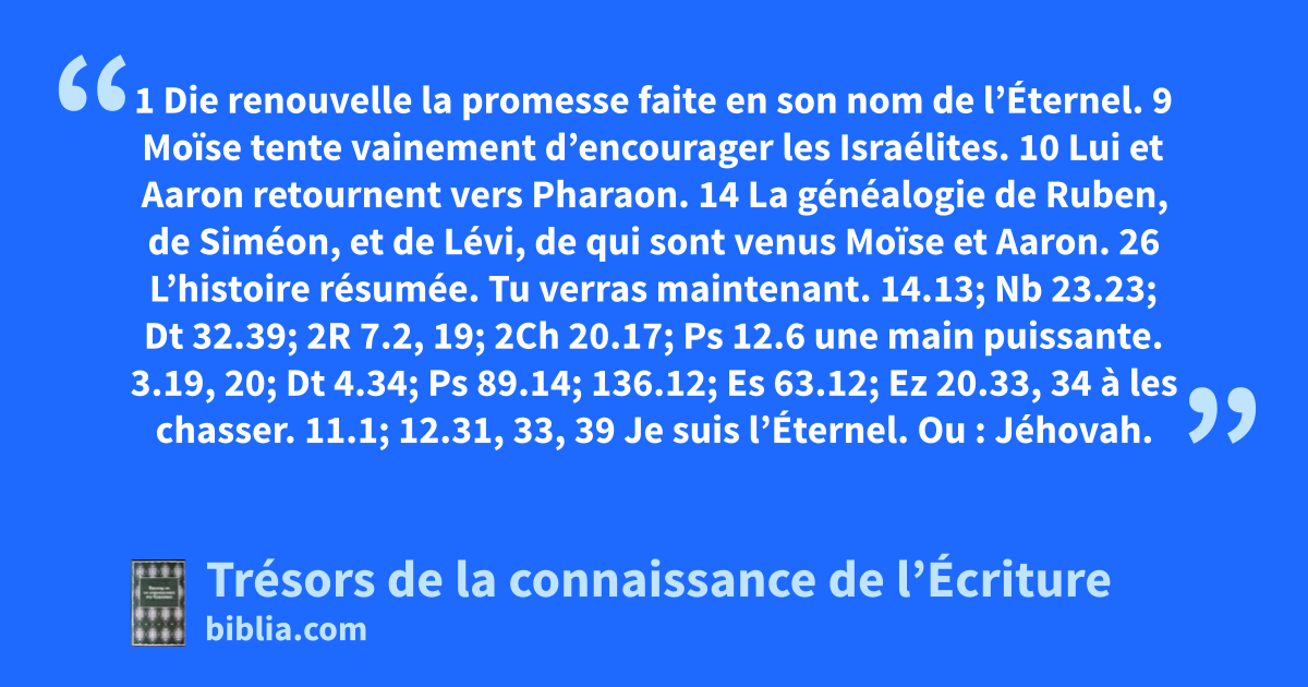 1 Die renouvelle la promesse faite en son nom de l’Éternel. 9 Moïse tente vainement d’encourager les Israélites. 10 Lui et Aaron retournent vers Pharaon. 14 La généalogie de Ruben, de Siméon, et de Lévi, de qui sont venus Moïse et Aaron. 26 L’histoire résumée.