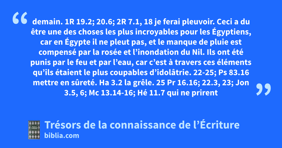 demain. 1R 19.2; 20.6; 2R 7.1, 18 je ferai pleuvoir. Ceci a du être une des choses les plus incroyables pour les Égyptiens, car en Égypte il ne pleut pas, et le manque de pluie est compensé par la rosée et l’inondation du Nil. Ils ont été punis par le feu et par l’eau, car c’est à travers ces éléments qu’ils étaient le plus coupables d’idolâtrie. 22-25; Ps 83.16